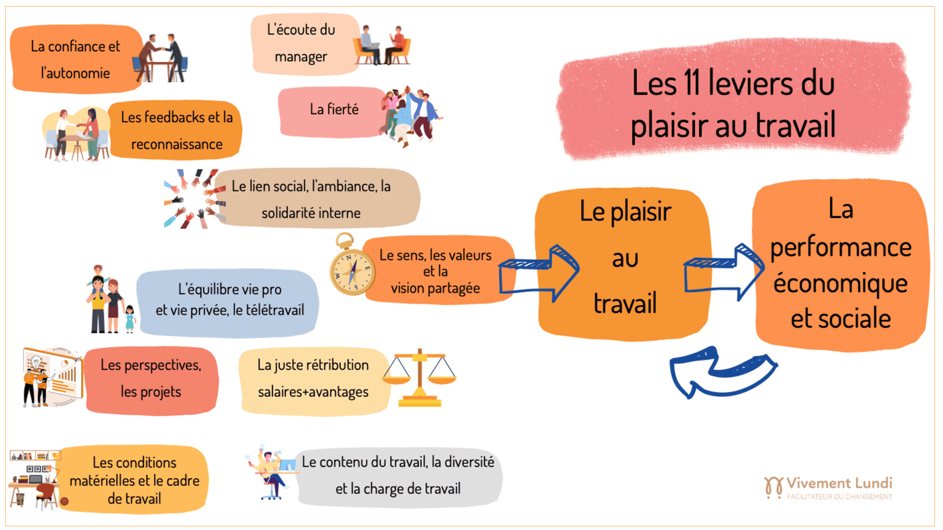 Le plaisir au travail est une forme de la QVCT. Laquelle est un des piliers de la RSE. Mais pourquoi chercher à développer le plaisir au travail ? Parce qu’une équipe qui éprouve du plaisir dans son travail est plus engagée, donc plus performante. Voici les 11 leviers du plaisir au travail. Quels sont les plus puissants pour vous pour générer du plaisir au travail ?